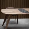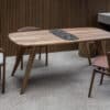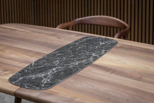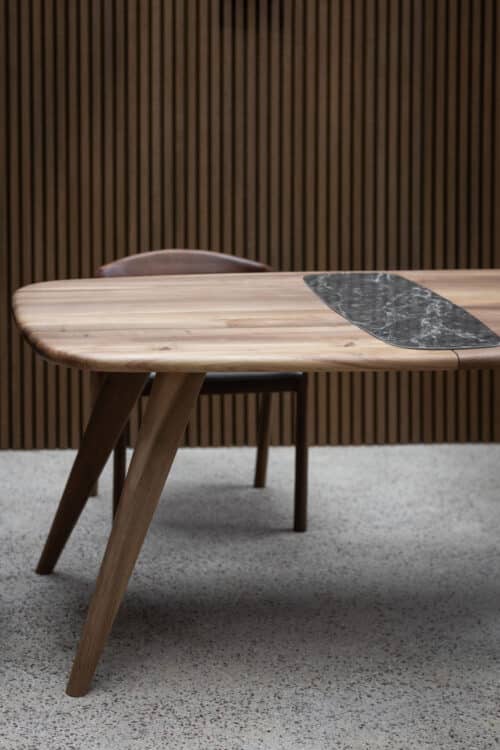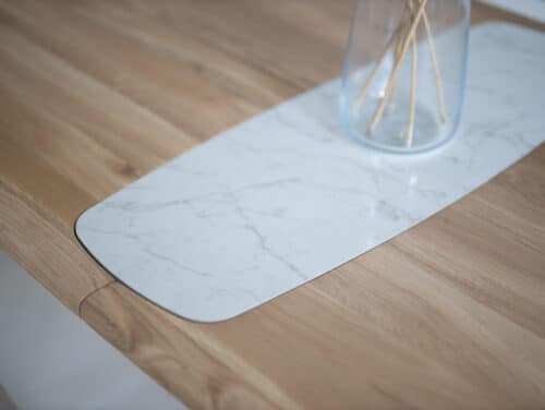 The table is entirely made of solid wood. Available dimensions are: 160x80cm; 180x90cm; 200x100cm; 220x100cm. Table height is 75cm. Tabletop consists of four pieces. Production time is 45–60 business days because all our products are handcrafted and customizable. Both wood options are treated with a natural water-based matt varnish. You can also choose between two types of marble porcelain Magnum tiles (Emperador Dark or Carrara).