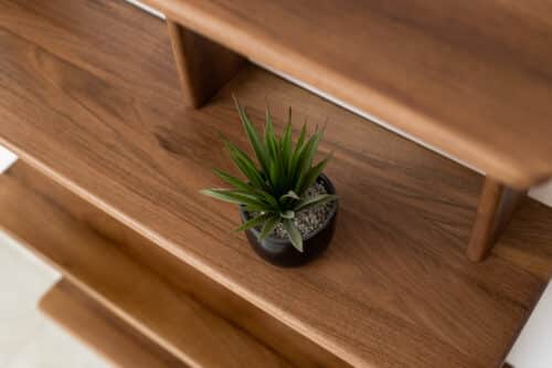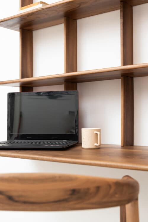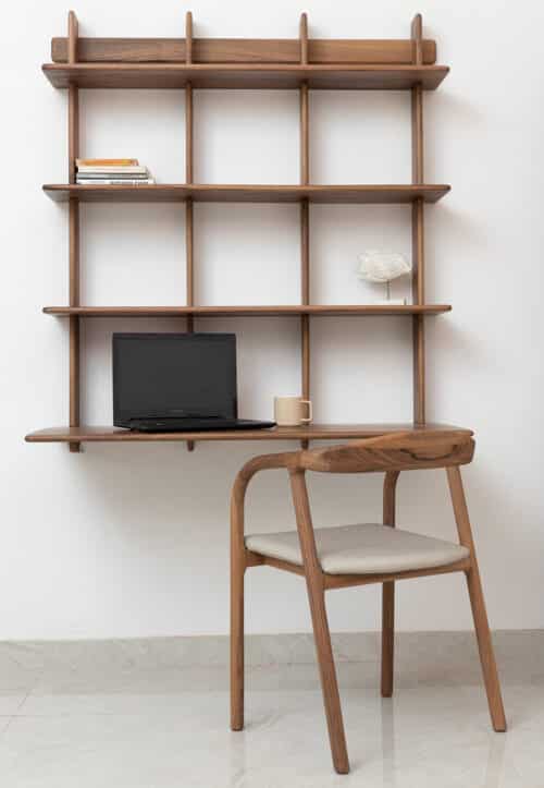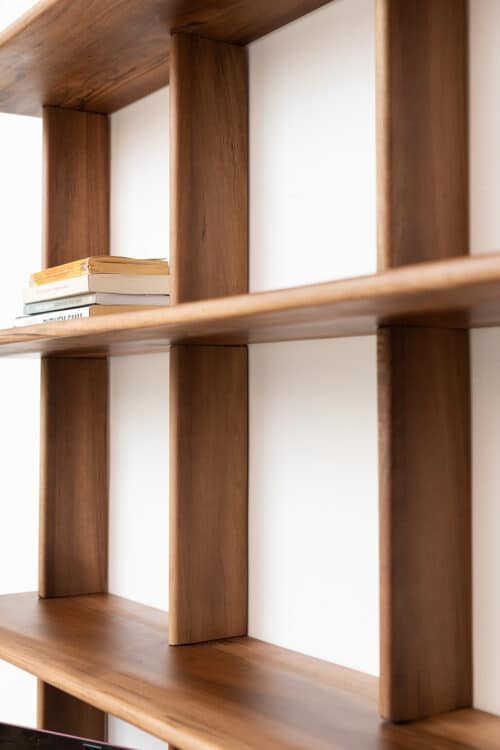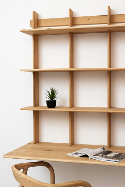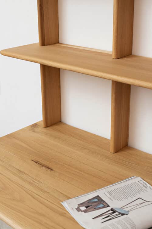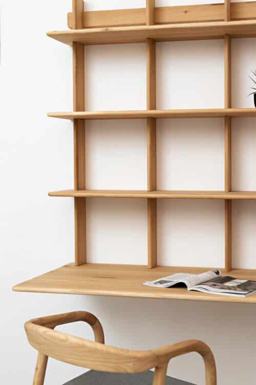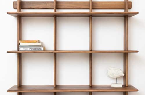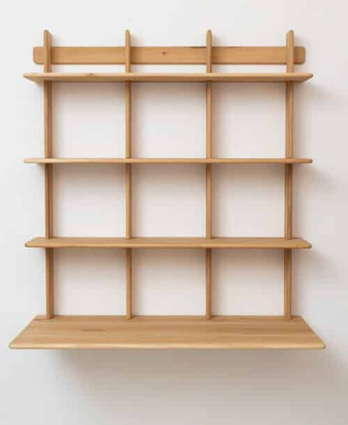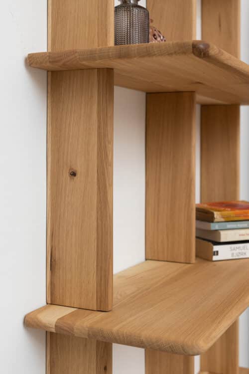 Shelf dimensions: width 123cm, depth 25 / 53cm, and height 133cm. Production time is 45-60 working days. A solid wood shelf is perfect for every house or home because of its simple and elegant line inspired by warm Nordic and Scandinavian design but with a French touch of elegance. An innovative self-installation system without glue or screws. The shelf is entirely made of solid wood that is treated with a natural water-based matt varnish. Every segment is handcrafted choosing the perfect wooden parts that have a similar texture.